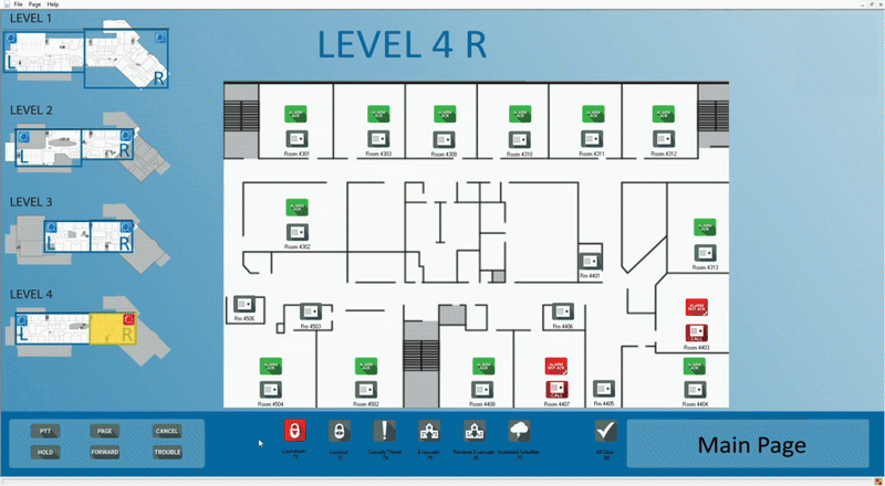 Staff can quickly acknowledge instructions, giving responders real-time visibility into which rooms have responded and which may need attention. Unacknowledged rooms automatically call in, helping responders check status quickly and discreetly.  Visual indicators show rooms that have responded, have not yet acknowledged, or have triggered a Medical or Security alert — giving operators dynamic visibility.